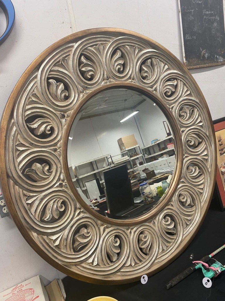 So, I found myself looking at a local online auction, and fell in love with a “large” mirror that was up for bid. Bill and I debated how large, large was, and let me tell you, his joke about how big this mirror would turn out, was a bad, accurate joke. This thing was huge!!! While I have a giant clock in my living room, I do not have space for another large round object on any wall anywhere else in my house.