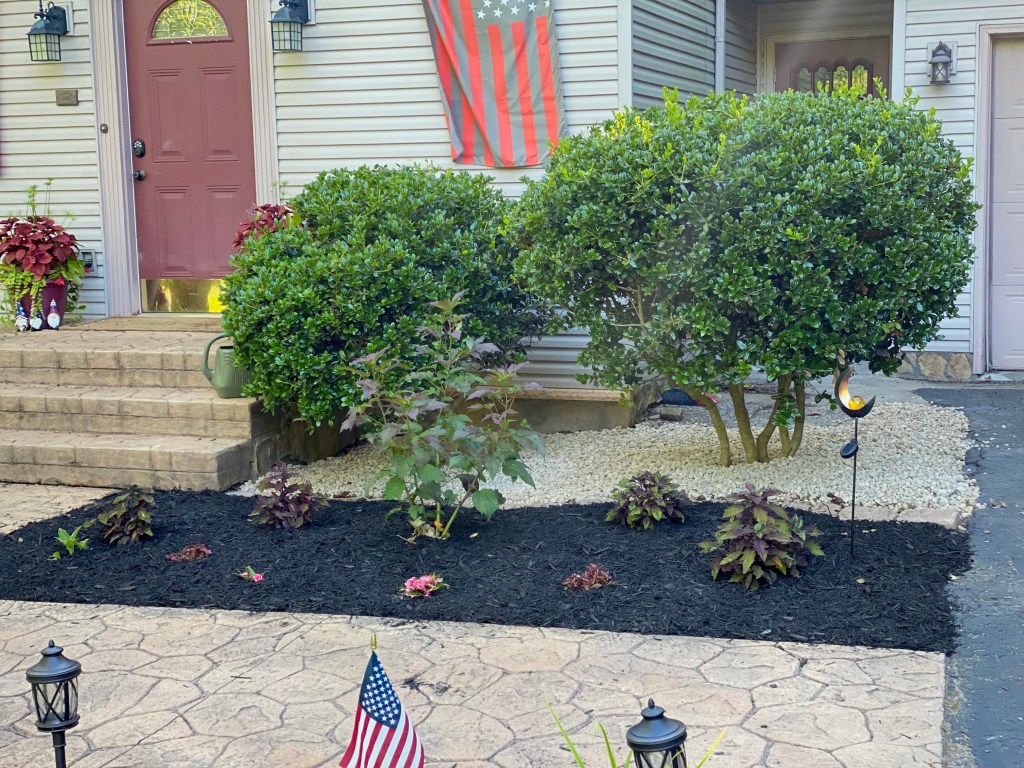 We have always put wood mulch in our flower beds, but for a couple of years, I have been wanting to put rock mulch in the back part of the front flower bed where the holly bushes are, and today that happened! We could not be more pleased with how it turned out! We still put black wood mulch in the front part, and the rest of the front beds, i love the contrast, but may have to convert to more rock later.