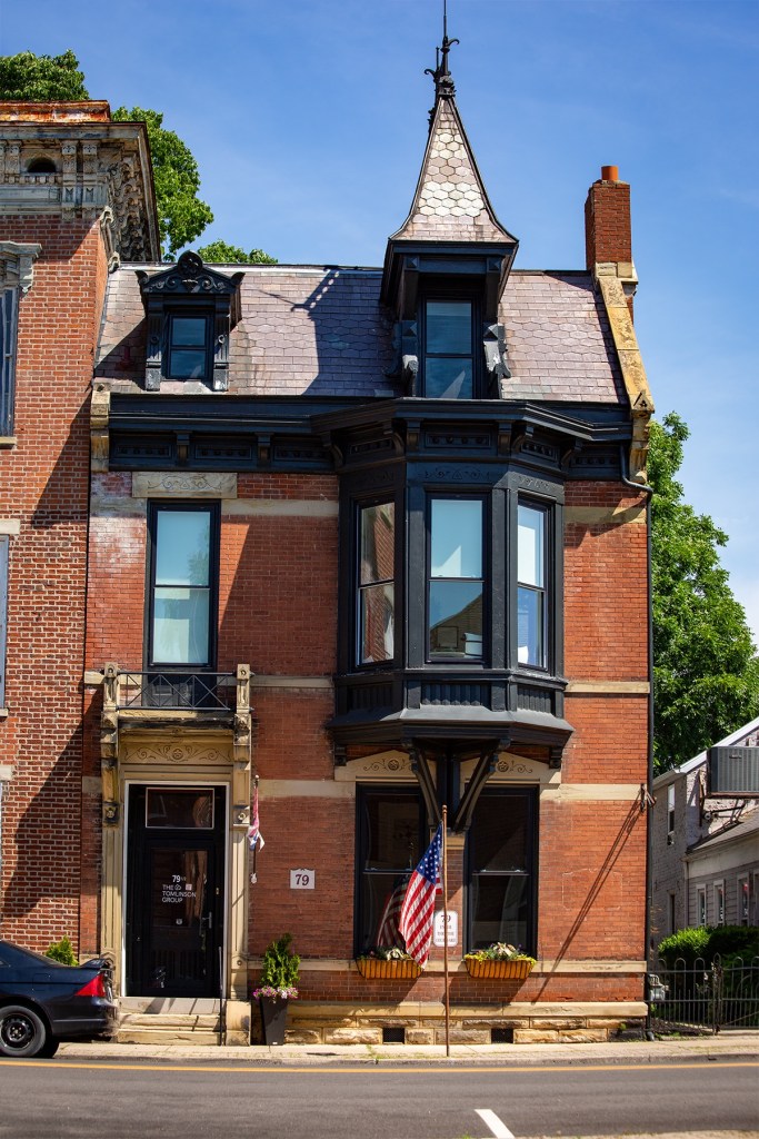 I love this porch vignette that the owner took care with. What a great use of space between these pillars, and their flower pots are beautiful! To me, brick and wrought iron are so classic! I drove off down the street after this capture, waved to a man sitting on his porch. He now owns the former house of a friend, I always loved the house and think the friend is awesome. Something piqued my mind, I told Bill that we had to circle back and stop and ask to shoot their porch with flags. So we did.