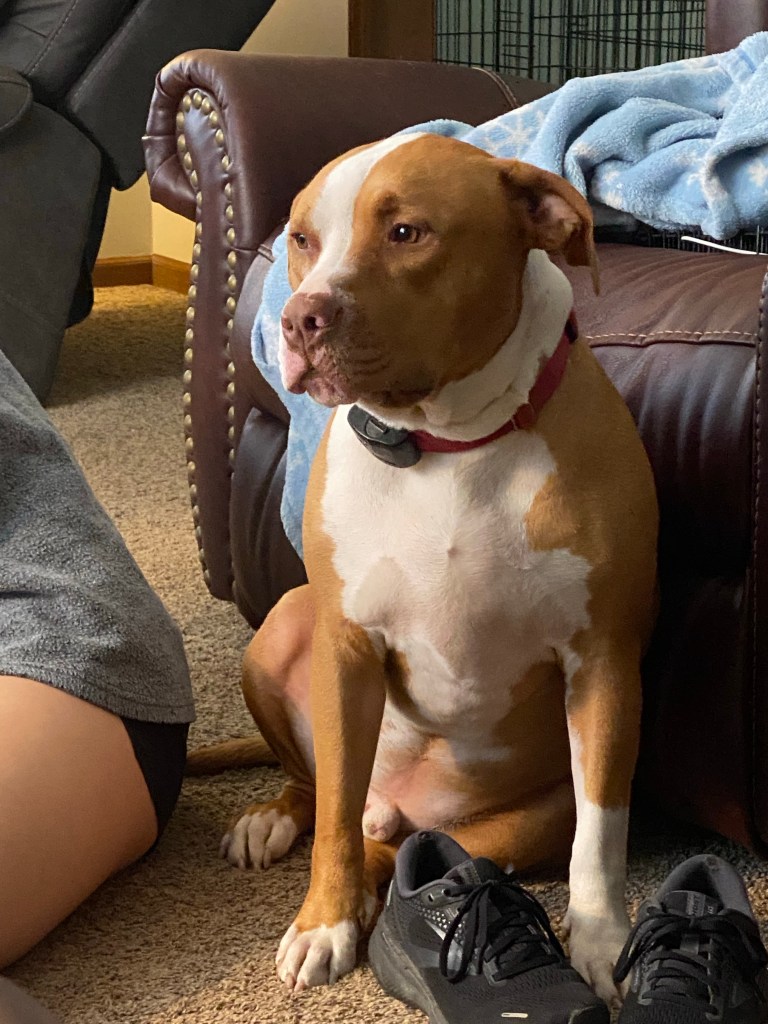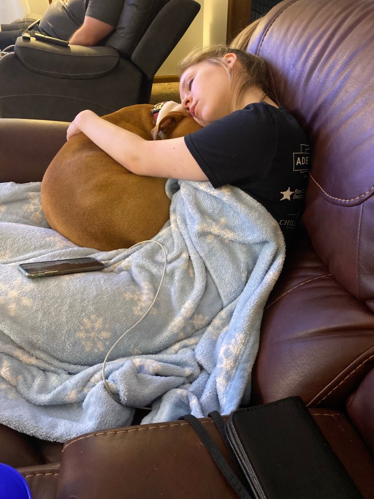 He and Brooke are snuggle buddies, he has been antsy all day for her to get home from work. I think she was glad to get home to be with him too! We all have the dogs sit with us at times, but there is always that one person the dogs prefer to sit with most. Ah, sweetness!