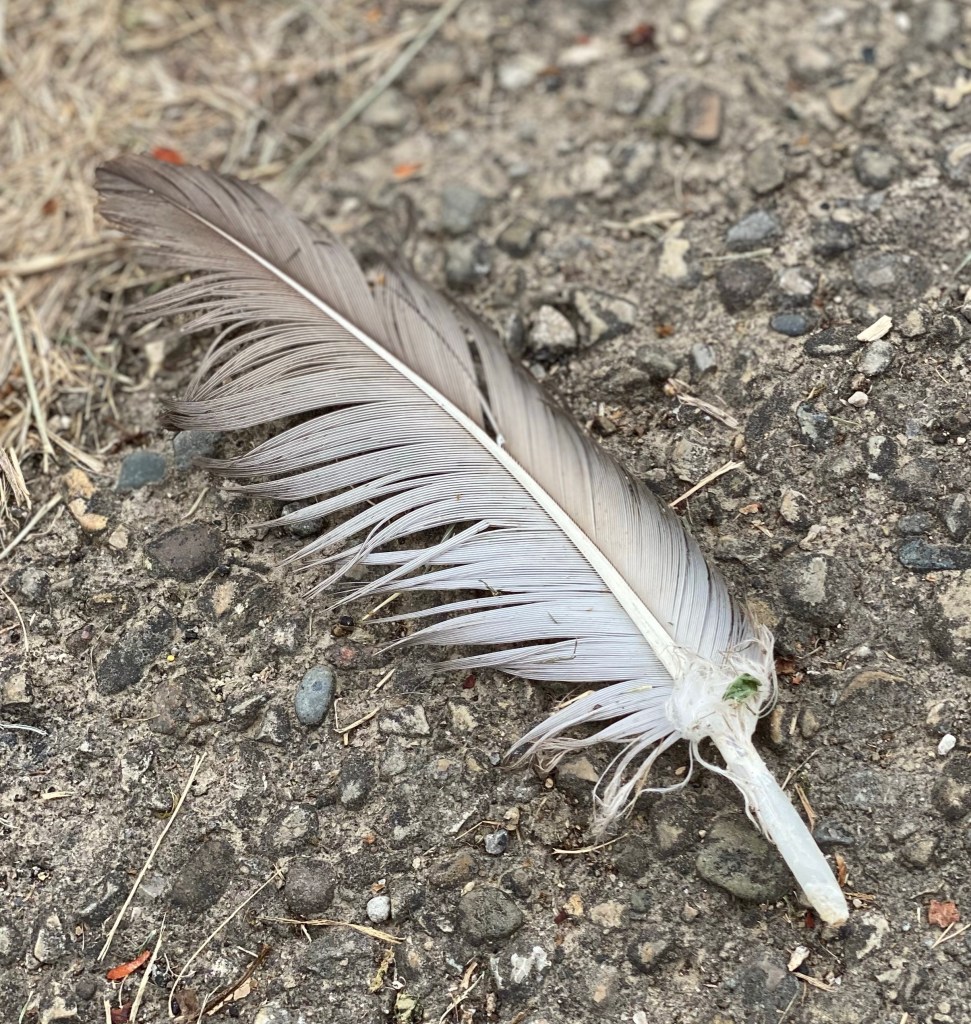I found a feather on our walk, and to me, finding feathers is always a sign for me. The sign is usually a message, sometimes that depends on the bird of the feather, the color, where I found it, or what I was thinking at the time-serving as confirmation. A gray feather can mean peace, harmony, calmness, also hope, optimism or positivity. This all sounds pretty darn good to me!
