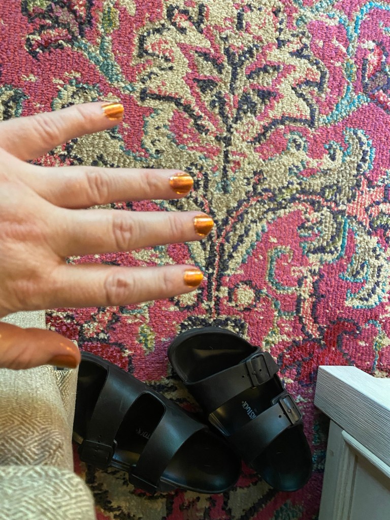 I was feeling pretty good so I cooked dinner with Bill, cleaned up, unloaded then reloaded the dishwasher, and hand washed the non dishwasher items. As I was scrubbing my big baking pan, I realized how I was ruining my manicure. And it hit me. Even though that felt like a waste of time to have painted my nails, only to ruin them hours later scrubbing, I enjoyed the process of painting them, and didn’t regret that. So, was it really time wasted?? I feel that is a definite no.