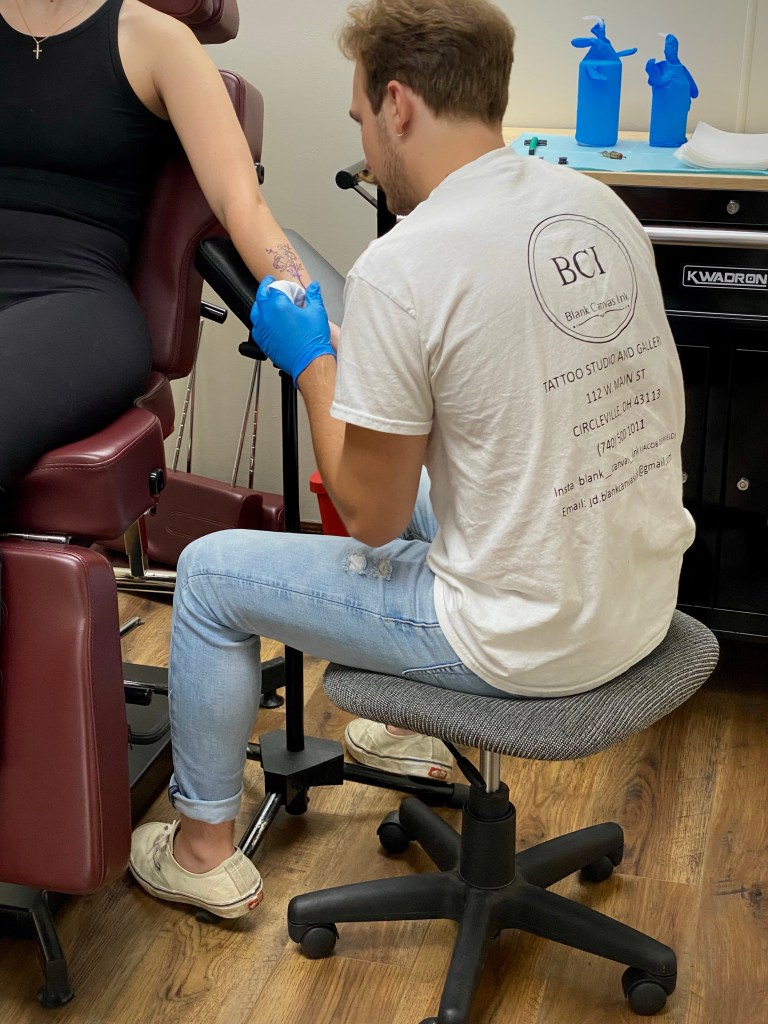 Jacob’s studio is new, located at 112 W. Main Street, Circleville. He is looking to add some additional tattoo artists and a piercer to his offerings in his studio, as well as showcasing local art, as I mentioned. Jacob is also considering offering some local art classes, if he can find time as his business grows. Seeing him interact with Brooke and watching him ask her about her career plans, I think he will make for a great mentor!