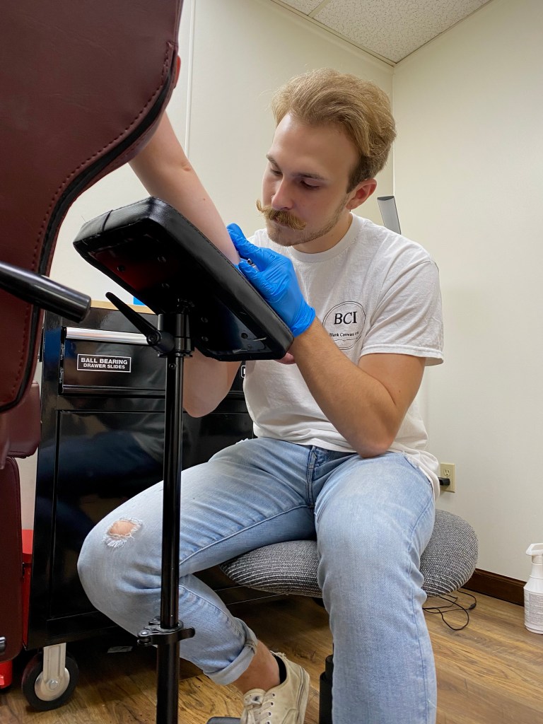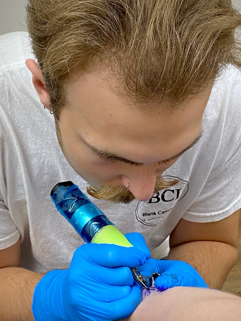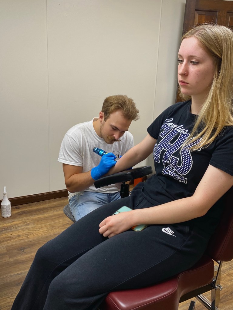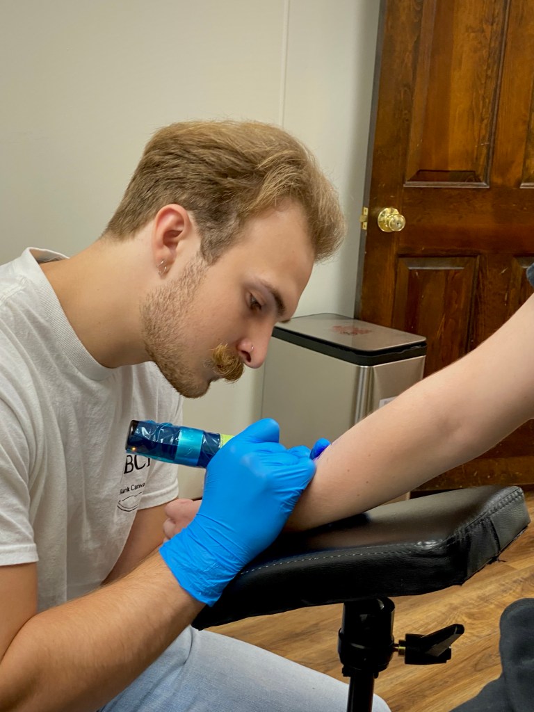 Jacob Dierfield of Blank Canvas Ink, does such sick lines, he is amazing! He is an outstanding artist, looking to do creative, one of a kind work, he wants to create your wearable masterpiece. Jacob also wants to showcase the art of local high school students in his studio, he has great vision for what he wants his own work to look like and encompass, art on skin, but he values art in all forms, and wants to foster the appreciation and value of art for others to see, and eventually purchase. I love his vision for fostering young people with and through art, and I loved the way he interacted with genuine interest, about what interests Brooke, about what Ave is planning with her life and career. Jacob is interested genuinely in people, and it shows.