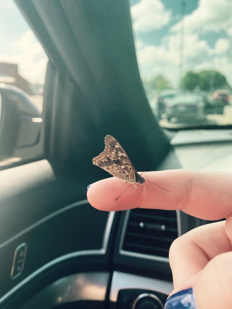 I had to have Bill put the car in park for me, and release my seatbelt, as my right hand was occupied with the butterfly. We got our of the car, and I went to put my new friend on a lovely tree. At first, it was hesitant and didn’t want to go, but once it did, I started to walk away and then the butterfly flew crazy around my head for a a few seconds before flying away.