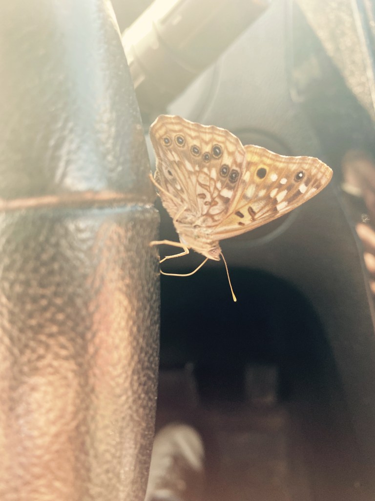 I totally forgot to tell you something cool that happened yesterday! I had a senior shoot at 9 am at a creek, I left there at 11, went and ran some errands, and around 11:45, this butterfly made it’s presence known by hopping on my steering wheel! This lovely is called a Tawny Emperor, and I realized that the only way this got in my car was while I had the back open loading up gear at the creek.