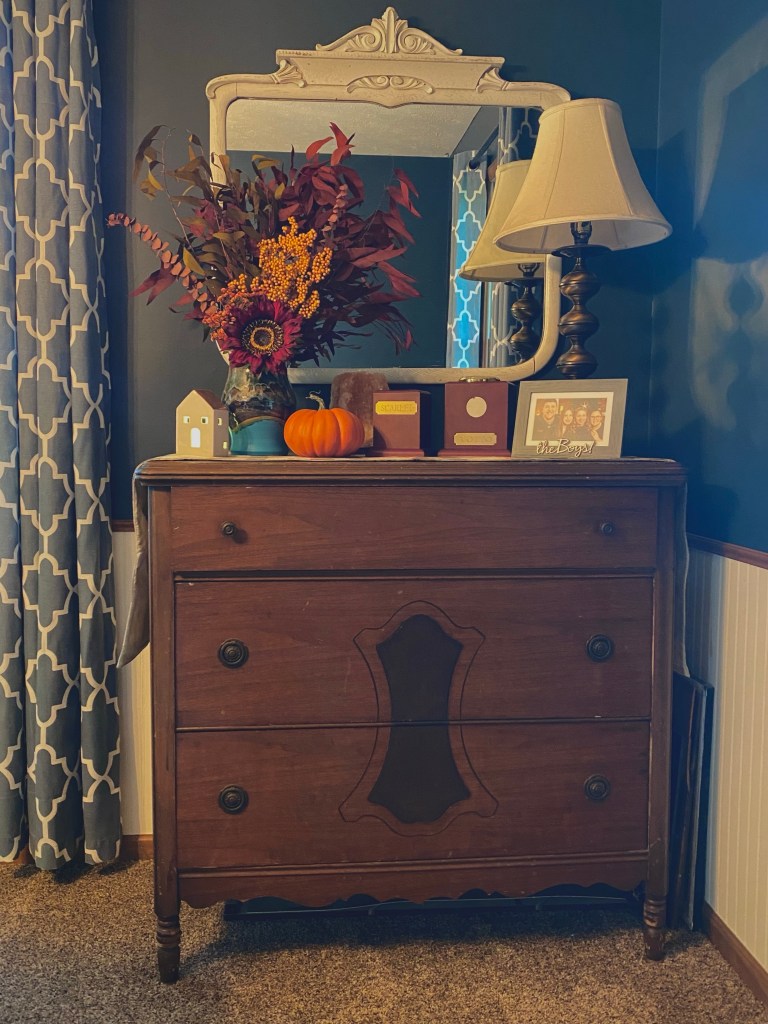In my dining room, I made the dresser a place of honor for our dogs who’ve passed, they are awaiting pictures to go on the urns.