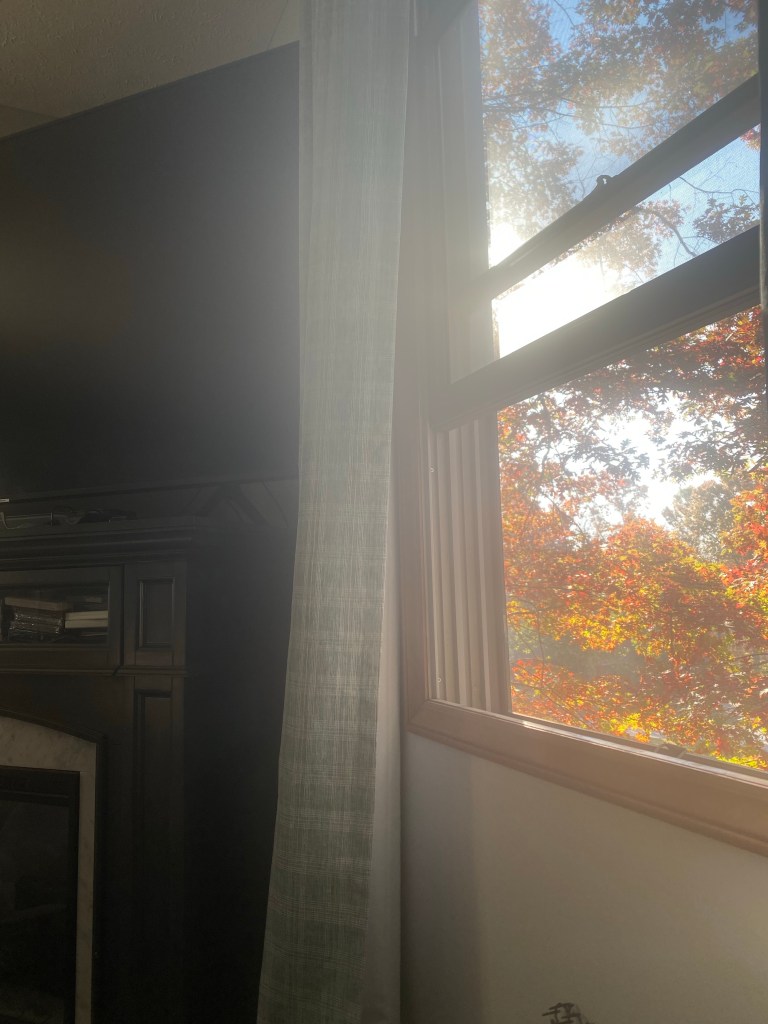I woke up this morning, sweating profusely again, Bill was hot too. We opened all the windows downstairs, and the ones in our bedroom, hoping to welcome in the fall air and cool ourselves down. We noticed over the course of the next couple hours, that the air had really turned chilly, and was getting even cooler pretty quickly. At 10am, we had already shut the downstairs windows, and were practically freezing, so we shut the upstairs windows too. It had turned nippy in a fairly short amount of time, add in the misty drizzle of rain, and no sun, it looked and felt almost winter like! I believe our days of 70 plus temps is over for this year, and our luck of achieving a high of 70 is dwindling as we speak.