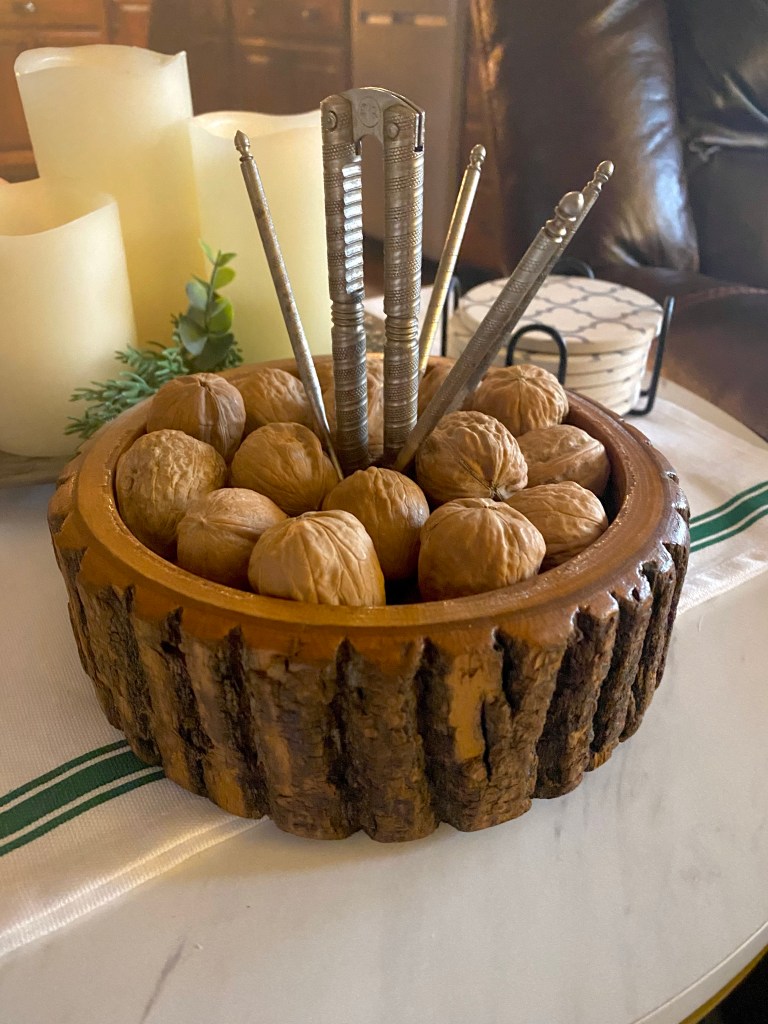 As we sat cracking walnuts reminiscing on childhood Christmas memories, I was transported back to a more simple time in life, a time that I miss and reflect upon fondly. As I sit, looking at my walnut bowl, I am reminded that while we can’t recapture the past, we can definitely purposely live and move towards more simplicity. We can also make our time better by focusing on those around us that are more meaningful, that cultivate more joy in our lives, and for the first time in about 30 years(or so), I will be spending time with my cousins that my bowl memories are associated with! I cannot wait to enjoy an evening laughing, reliving shared memories and making a new tradition for years to come…and to think, a walnut bowl will be holding all of this together, the rest of my life! I love it.