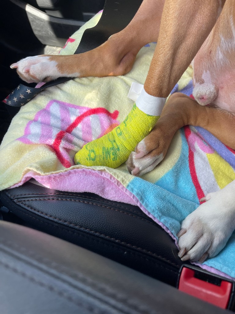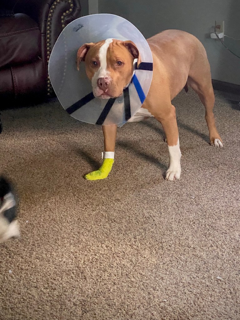 A couple days ago, Sonny was playing and ripped a nail down at the nail bed of his paw. He was limping and crying, so we knew he needed to head to the vet. He also added an additional back leg limp when his dad got home from out of town work this week. Yesterday, he and Bill headed off to the vet, this is the result, a Sonflower.