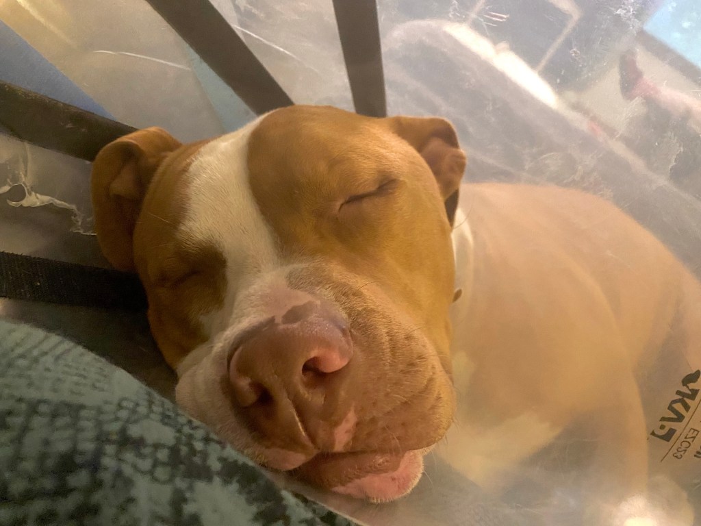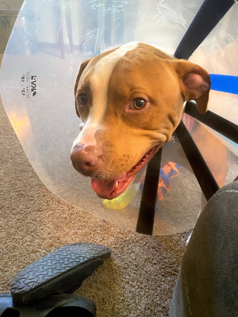As you can see, he is somehow managing, although the cone is now not only a weapon, but an extended apparatus to smack us all with, to make sure we do his bidding. If you see us all looking haggard today, just understand the sleepless night of constant pacing we all endured last night.