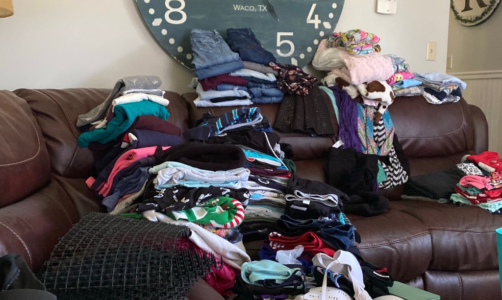 Today is about getting rid of some things that were in the basement, clearing out old to have room, not for new in this case, but for less. Yes, we are still doing projects in the basement, with vacation and Bill traveling for work, we had to put things off until now. I cleared out all of these clothes, that I asked my children to not put in the basement some time back, and started to rearrange some of the storage. Why do we put things we no longer need in the basement? Well, that stuff will all be coming up and out soon enough!