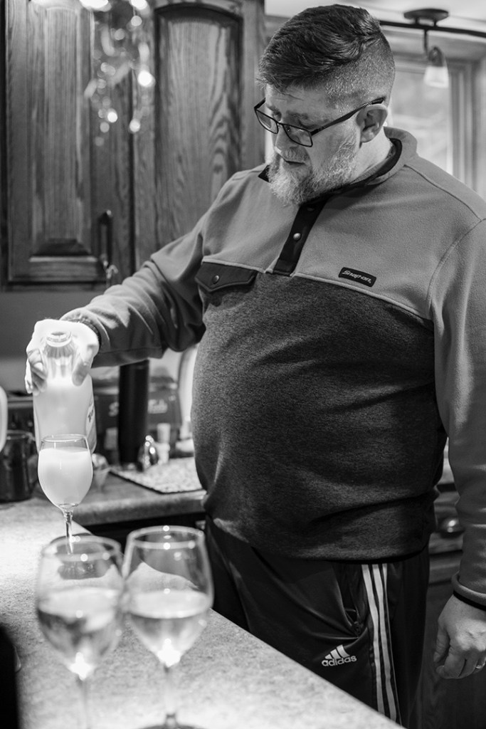 See, no two are the same. Brooke is not having a mimosa, pour on Bill! Here, he is working on Avery’s drink, a lower champagne to oj ratio. Can you figure out whose glass is on the left, above??